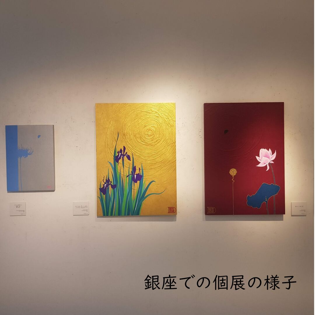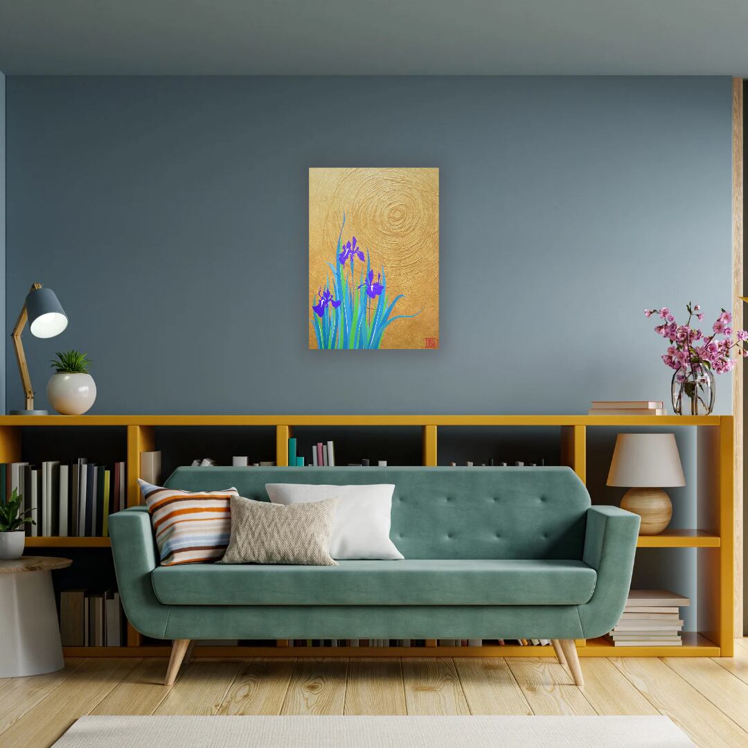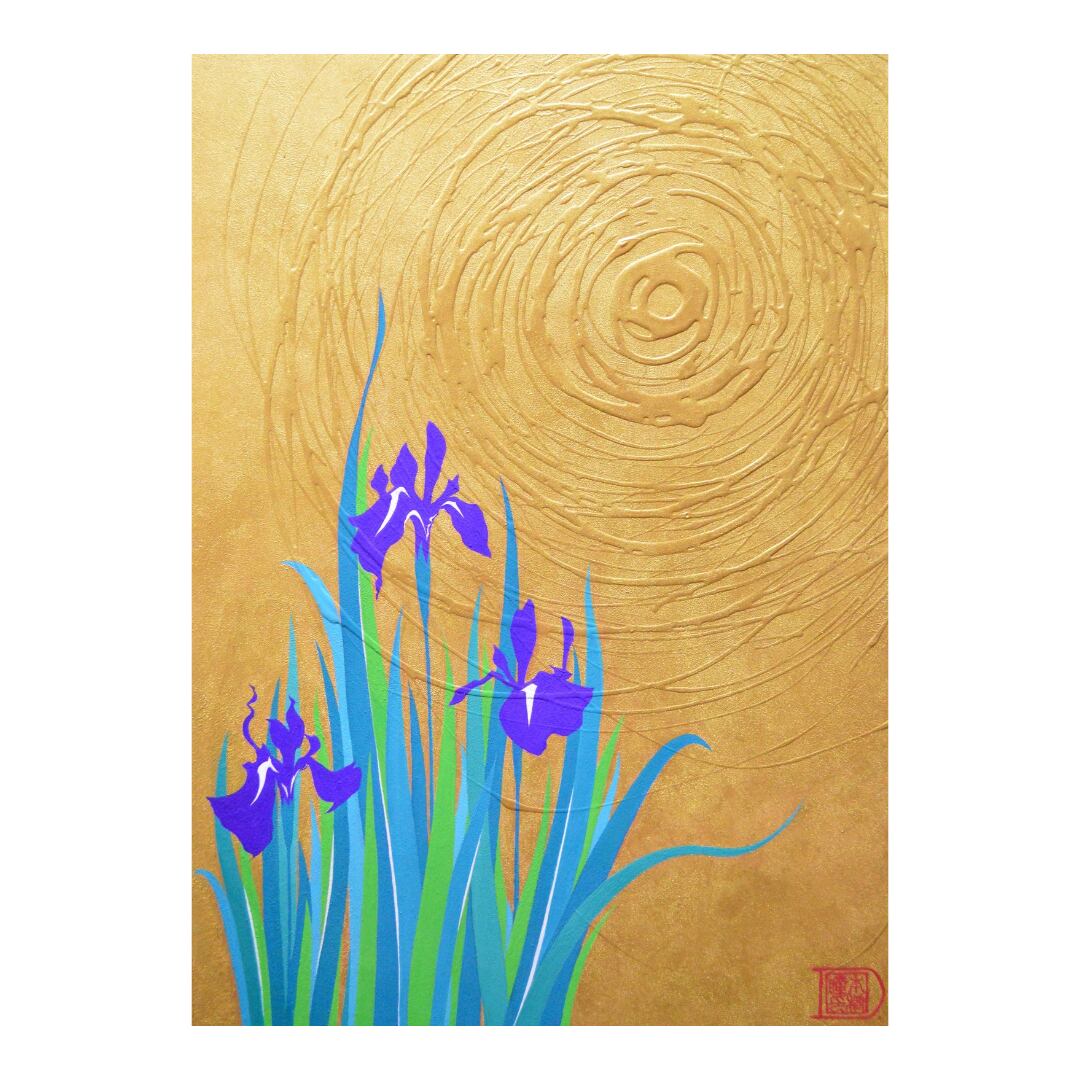 作品の見どころ:●カキツバタの江戸紫と浅葱色の葉のコントラストなどです。 ●作品で使用しているアクリル絵の具は日本製で最高品質のものです。発色が美しく、永くおたのしみいただけます。