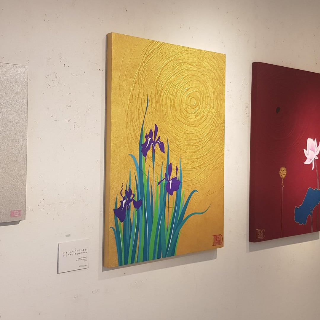 カキツバタと新月の(見えない)月を描きました。 タイトルは万葉集の一句です。 ここにいない大事な人を思い出す、という一句です。 月は、確かにあるけれど(見え)ないだけ、というところを歌に重ねました。 見えない人やものやことを想う気持ちを「思慕」とも言いますが、これはカキツバタの花言葉の一つでもあります。 カキツバタが月を想う気持ちを、自分の大事な人を想う気持ちに重ねるなどしても楽しめるかと思います。
